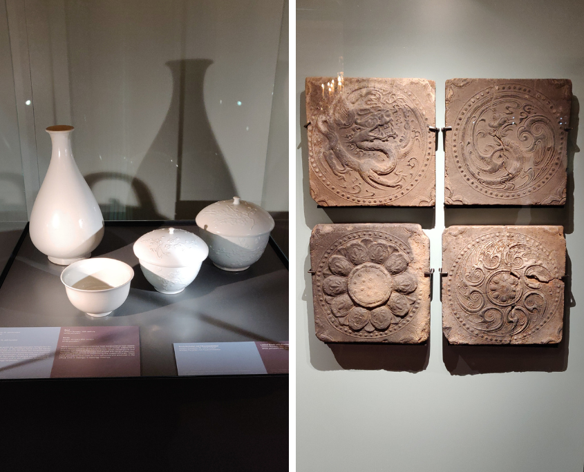 Grabfunde aus der Goryeo-Dynastie (918-1392 n.Chr.), aufwendig gestaltete Dachziegel und Tempelplatten, ein Sutra-Buch in Goldschrift aus der Zeit der Tripitaka-Schriften des Buddhismus und jadegrüne Seladongefäße sind in verschiedenen Bereichen ausgestellt. In einem weiteren Raum finden sich sog. „Moon-Jars“, Porzellankeramik der koreanischen Joseon-Dynastie (1392-1910) aus dem späten 17. Jahrhundert und Buncheong-Keramiken, die durch ihre Schlichtheit beeindrucken. Als Exportware der japanischen Kolonialzeit Koreas prägten sie die moderne Keramikkultur weltweit.