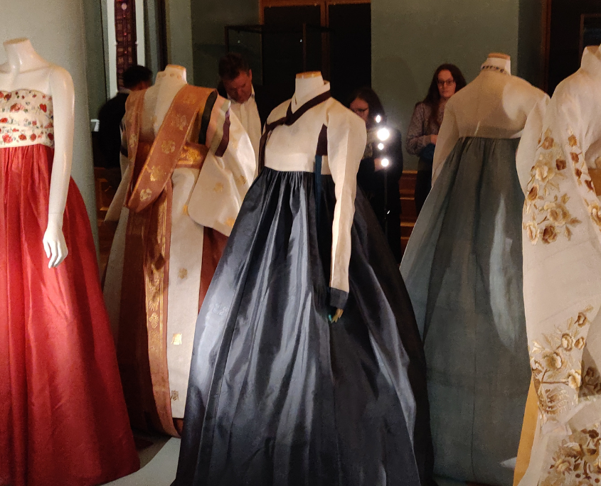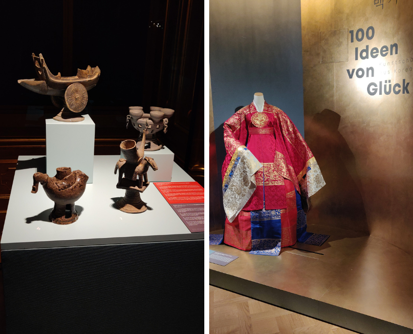 Darunter eine der nur fünf erhaltenen wertvollen Königskronen der Silla-Kultur (57 v.Chr. bis 935 n.Chr.) kunstvoll in antiker Goldschmiedekunst mit reichlich Jadeanhängen verziert. Direkt am Eingang der Ausstellung sind ästhetisch anmutende Hanbok-Gewänder zu sehen, die in Korea bis heute zu besonderen Anlässen getragen werden und Modedesignern immer wieder als Vorlage und Inspiration dienen.