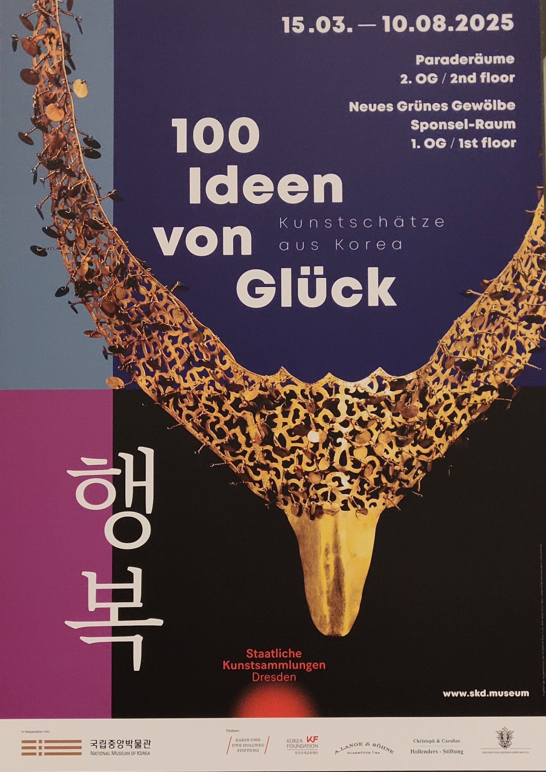„100 Ideen von Glück“ ist noch bis zum 10.August 2025 in den Paraderäumen des Residenzschlosses Dresden und im neuen Grünen Gewölbe (Eingänge Sophienstraße und Schloßstraße, Öffnungszeiten 10-17 Uhr, Dienstag geschlossen) zu sehen. Ein Buch zur Ausstellung ist verfügbar und kann über den Buchhandel und vor Ort erworben werden.